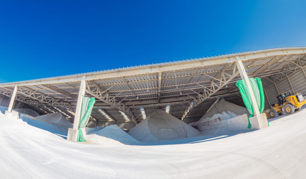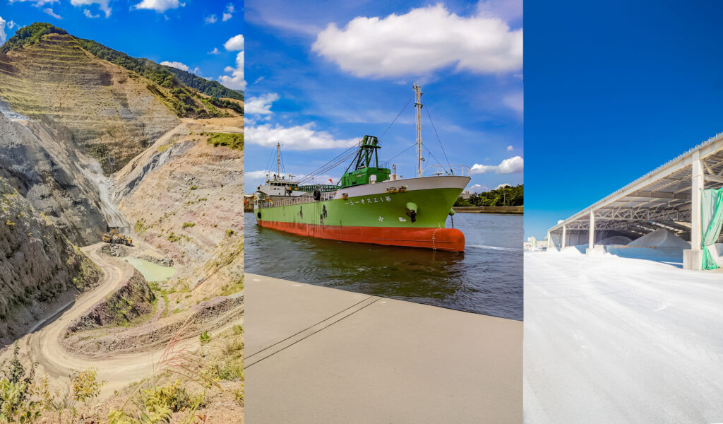 トウザキは、100年先の安心のため、生コンクリートの原材料に一切の妥協をせず、厳選した原材料を日本全国から集めています。西日本からは船で輸送し、千葉県市川市のヤードに大量保管し安定供給を叶えています。東日本は鉱山の近くである栃木県佐野市に拠点を構え、自社トレーラーで厳選素材を安定供給しています。