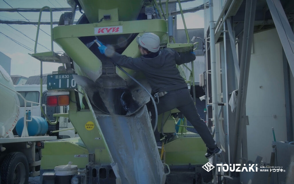車両をチェック、洗い場で機械の中を濡らし、水を出し切ってから生コンを入れに行きます。
